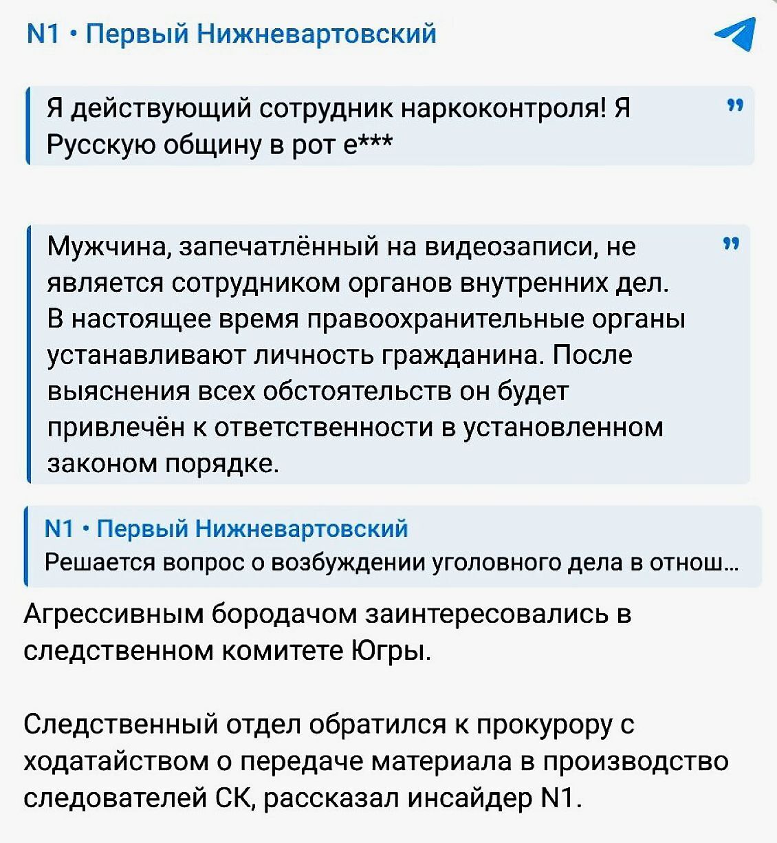 Телеграм-канал «N1 • Первый Нижневартовский» дополнил цитату из речи бородатого Штирлица, где он почему-то обидел местную «Русскую общину», рассказав о своих орально-сексуальных намерениях, хотя непонятно, чем она могла насолить интернациональному борцу с наркоторговлей.