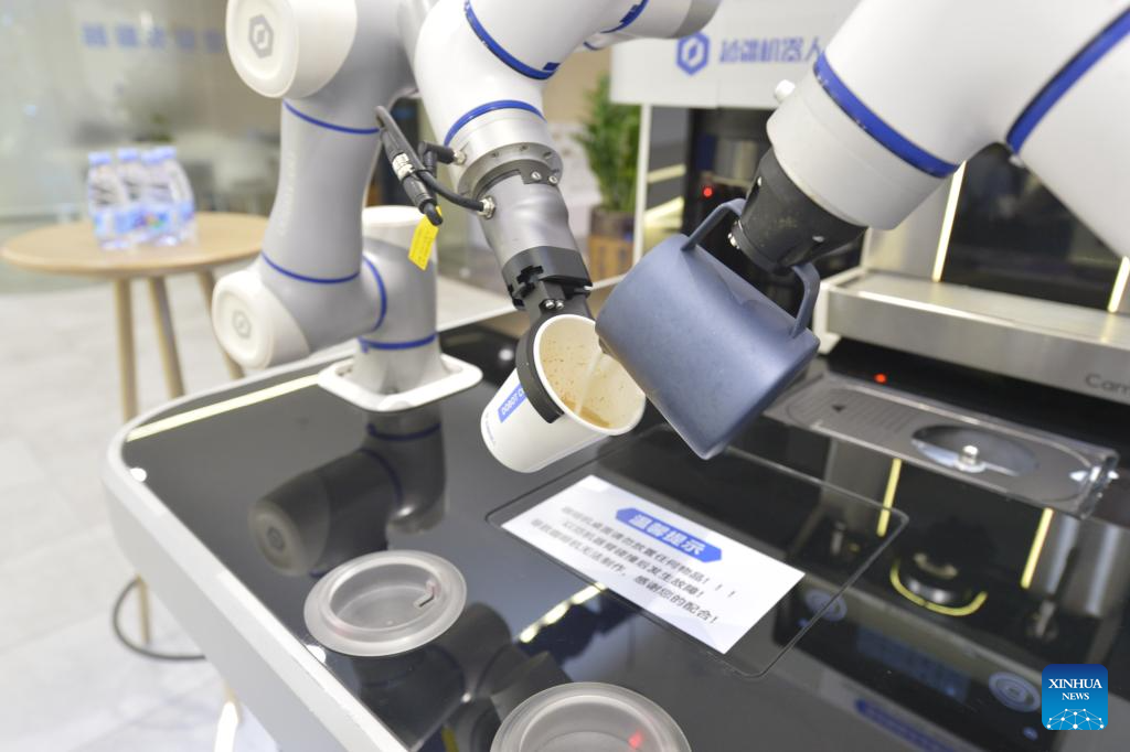 Человекоподобный робот готовит латте-арт в компании DOBOT, занимающейся разработкой коллаборативных роботов, в Шэньчжэне, провинция Гуандун на юге Китая, 29 октября 2025 года. (Синьхуа/Лю Лихан)