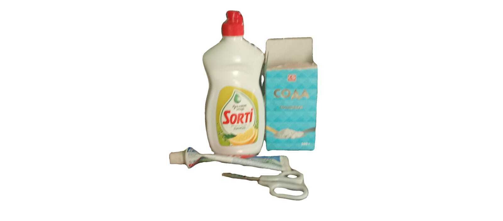 Для средства нам потребуется всего три ингредиента - это сода, моющее средство для посуды и старый тюбик зубной пасты.