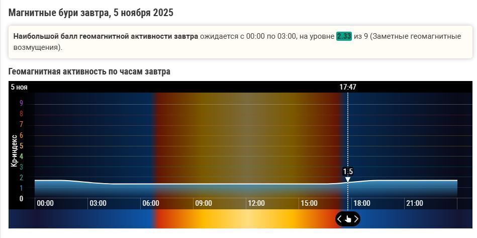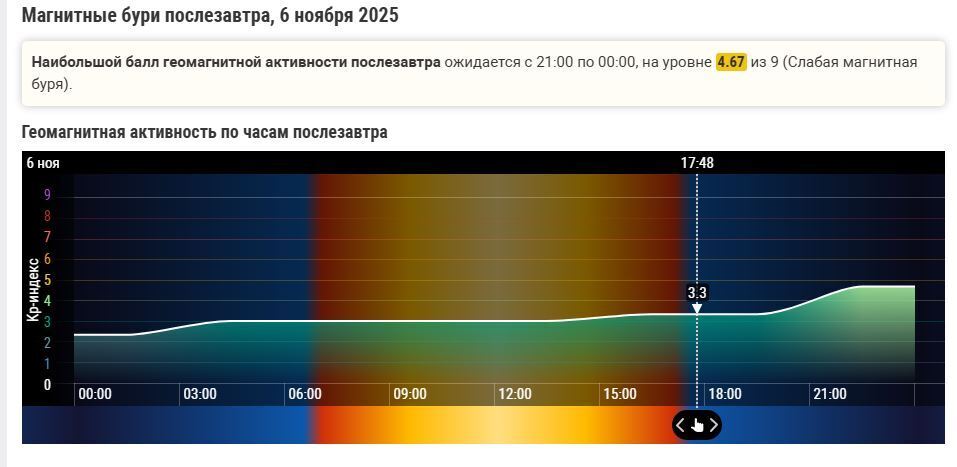 Геофизики предупреждают, что начиная с позднего вечера 6 ноября и далее возможно усиление геомагнитных процессов. Ночь на 6 ноября начнется достаточно спокойно — Кр-индекс составит стандартные 2 балла. Однако уже в утренние часы отмечается постепенный подъем показателя до критической отметки.