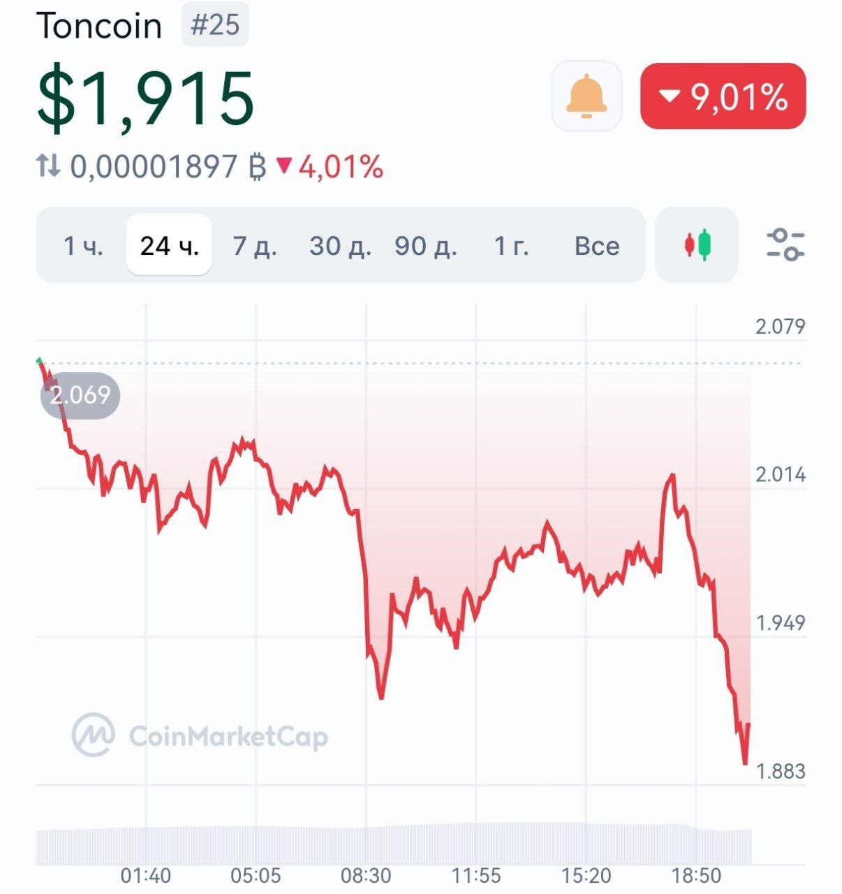 TON обвалился на 10% за сутки. За месяц крипта Дурова рухнула на 35%.