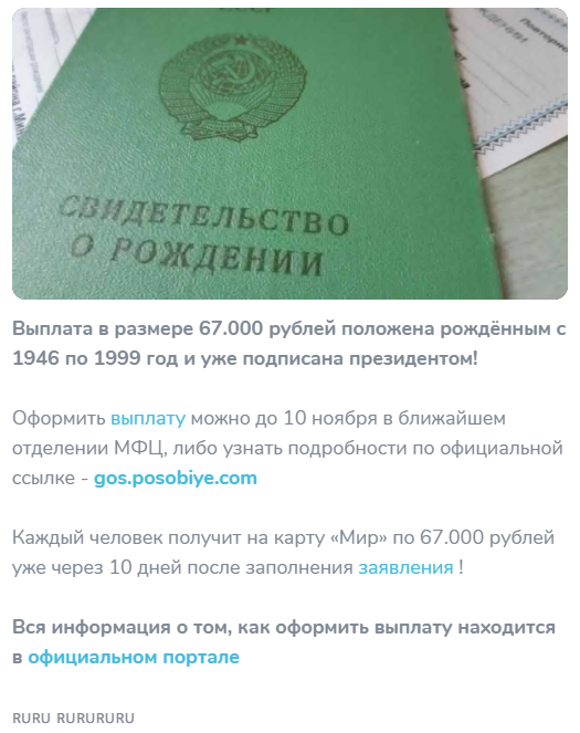 Обещают «выплаты по 67 тыс. рублей каждому рождённому с 1946 по 1999 г.г.» Не хотите ли получить денежки?