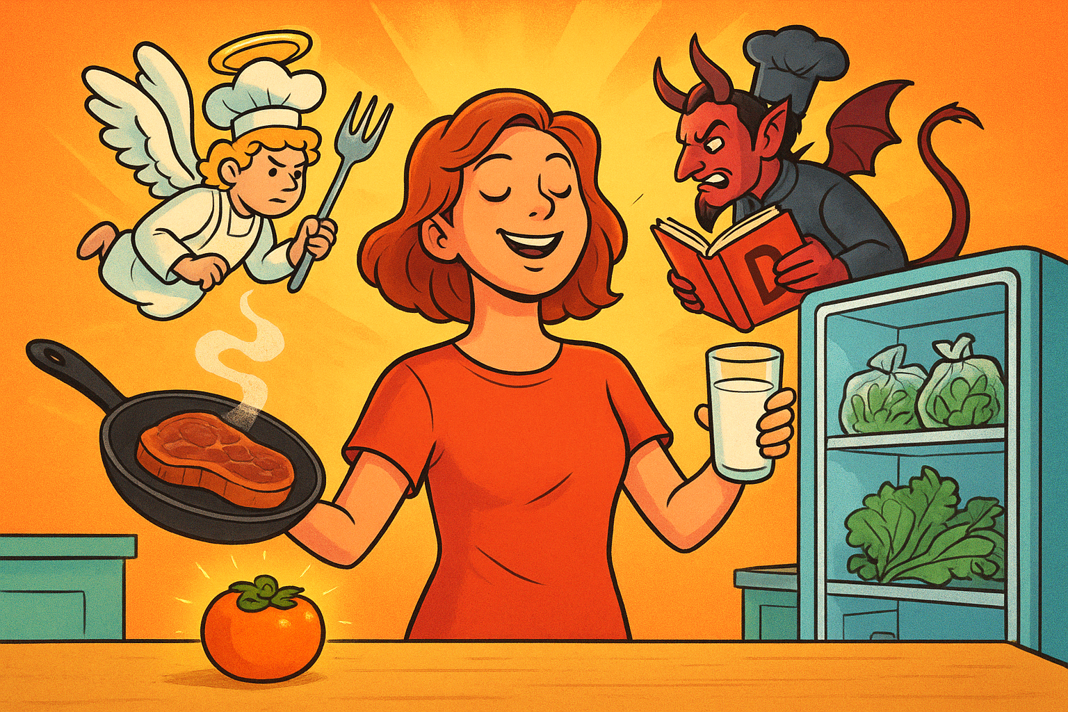 Не в смысле растворилась в воздухе. Она удалилась в самое сакральное место квартиры... в туалет. Дверь закрылась. Из-за неё доносились лишь приглушённые вздохи, звуки борьбы и тихое бормотание, в котором угадывались проклятия в адрес мяса, молока, хурмы и самой идеи диет вообще.