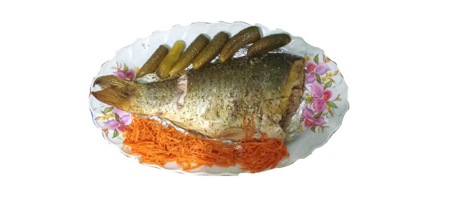 На фотографии, которую вы наблюдаете выше, я украсила сазана маринованными огурчиками и корейской морковкой, в качестве гарнира у нас был картофель пюре. При желании вы сможете украсить рыбу по своему вкусу и выбрать любимый гарнир.