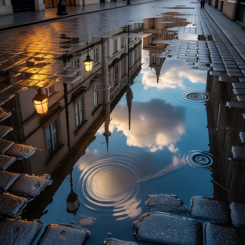 Лужи - это круто! Они как маленькие миры из воды, которые отражают небо, облака и всё вокруг. Иногда там можно увидеть даже огни города или старые дома.