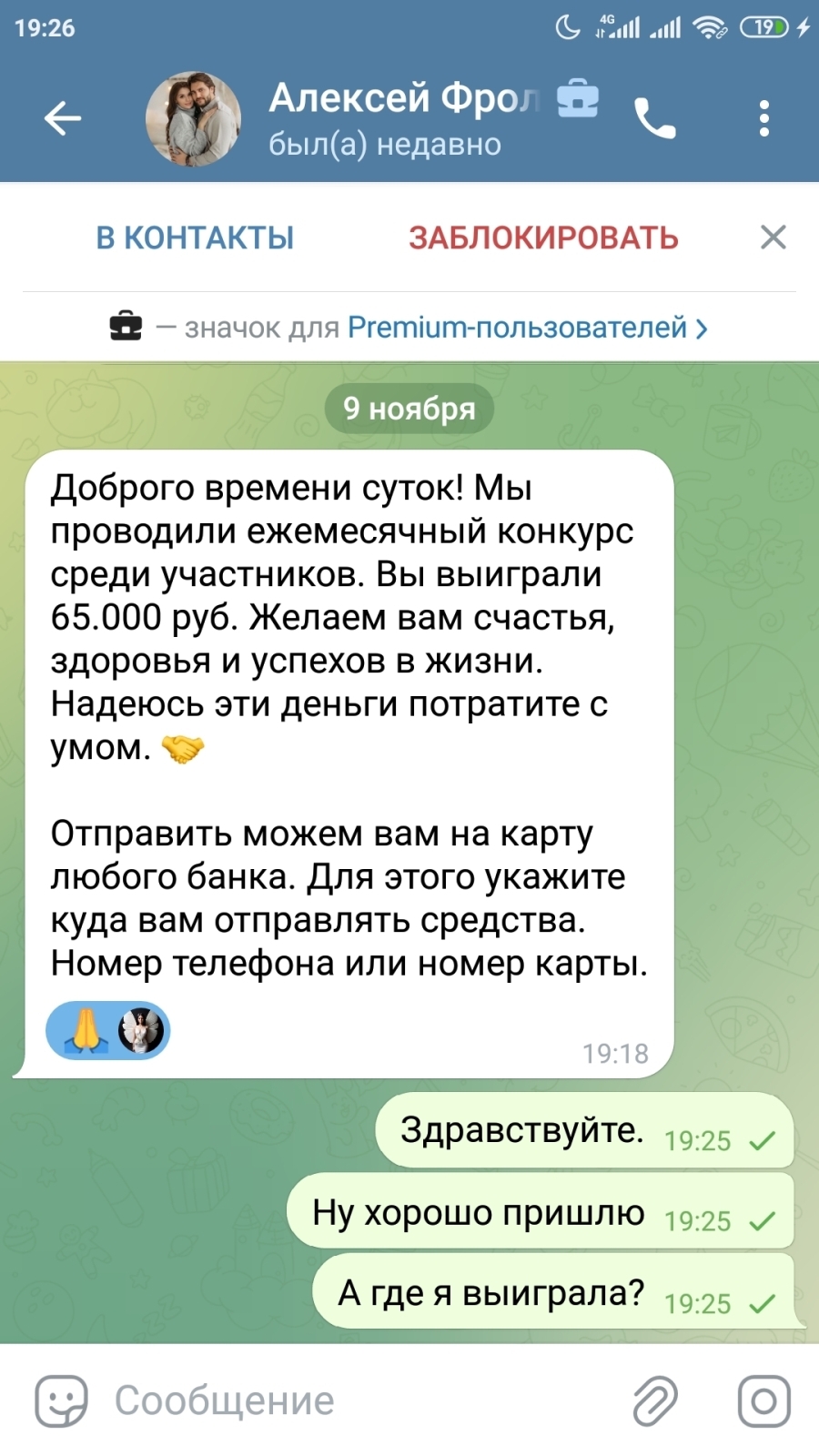 Это было вечером, я решила немного отвлечься и зашла в Телеграм, чтобы полистать новости и общение. Вдруг мне в чате пишет неизвестный человек, который начал уверять, будто я выиграла крупную сумму — 65 или даже 70 тысяч рублей. Он сказал, что это особенная акция, и я просто должна подтвердить своё участие. Честно говоря, сразу почувствовала неладное, но взялась за телефон, решила посмотреть, что там происходит.