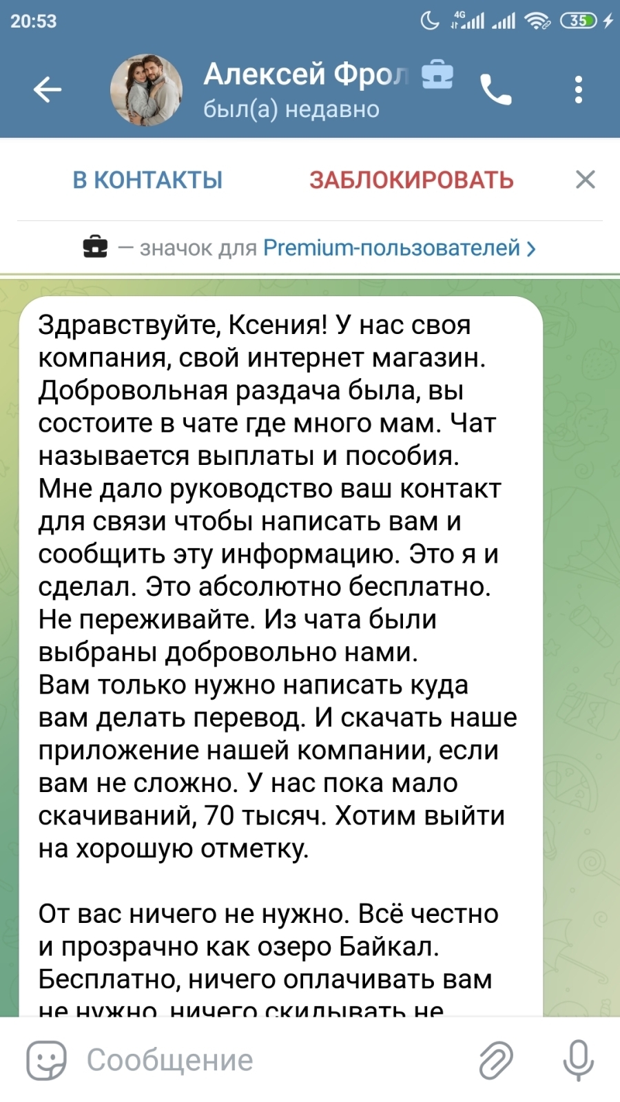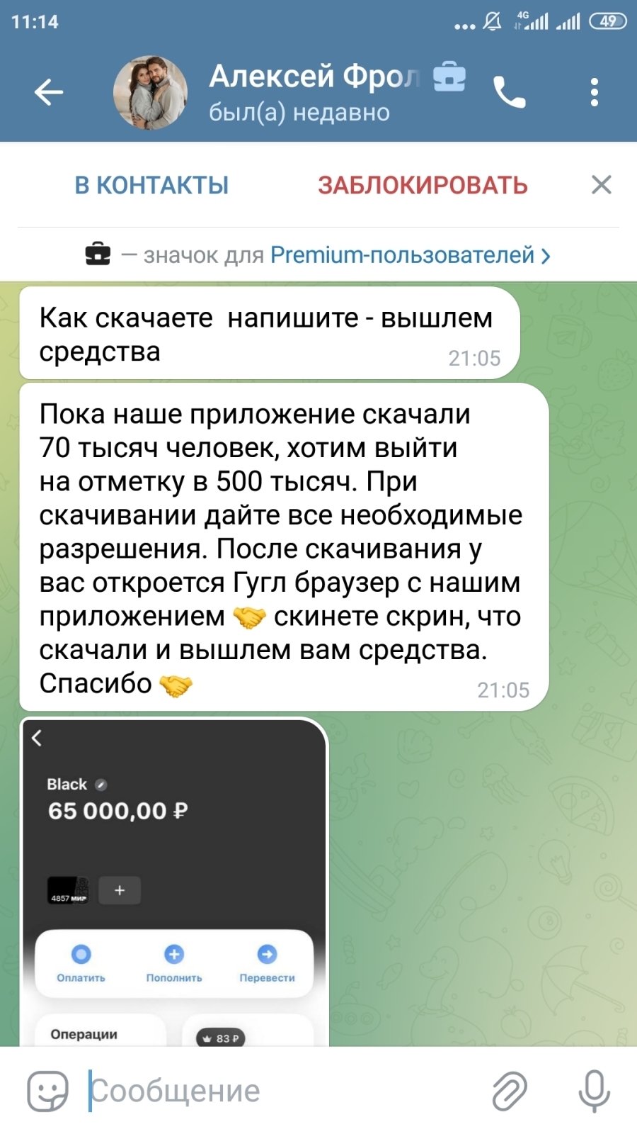Если внимательно смотреть на скрины то видно, что это мошенники. Просят скачать приложение и потом скинуть им скриншот, для того чтобы украсть мои данные. И да, я связалась с администрацией этой группы, где типо меня выбрали, и она подтвердила то, что он мошенник. Так что сто процентов!