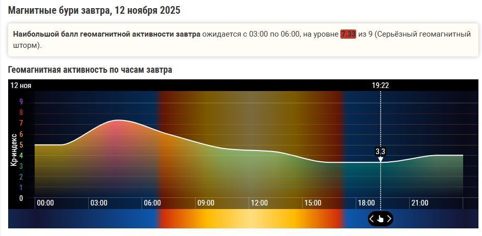 Согласно расчётам учёных, геомагнитный шторм начнётся около 18 часов вечера 11 ноября и стремительно усилится, достигнув своего максимума примерно в 9 утра следующего дня, когда индекс Кp составит критическое значение 7,3, соответствующее уровню G3. Затем, начиная с 9 утра, мощность шторма снизится до G2, однако сама буря продлится ещё как минимум до обеда, медленно затихая вплоть до 18 часов вечера. Полностью Земля стабилизируется лишь временно, поскольку уже вскоре космическая погода вновь грозит вернуться к активной фазе.