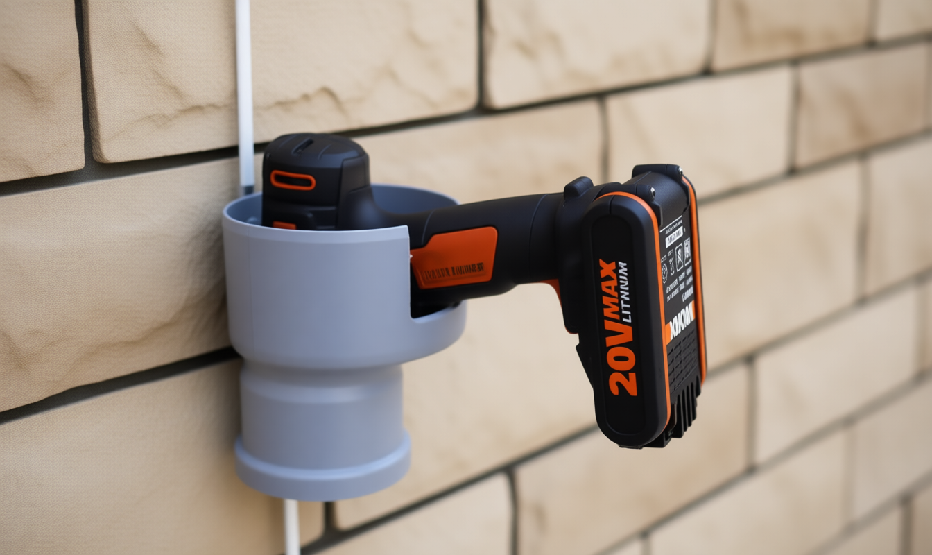 Первый лайфхак — это держатель для аккумуляторного шуруповёрта. Из обычного пластикового раструба за считанные минуты можно сделать удобную подставку, которая крепится к столу или стене, освобождая рабочее пространство.