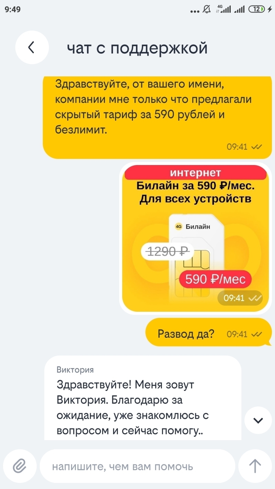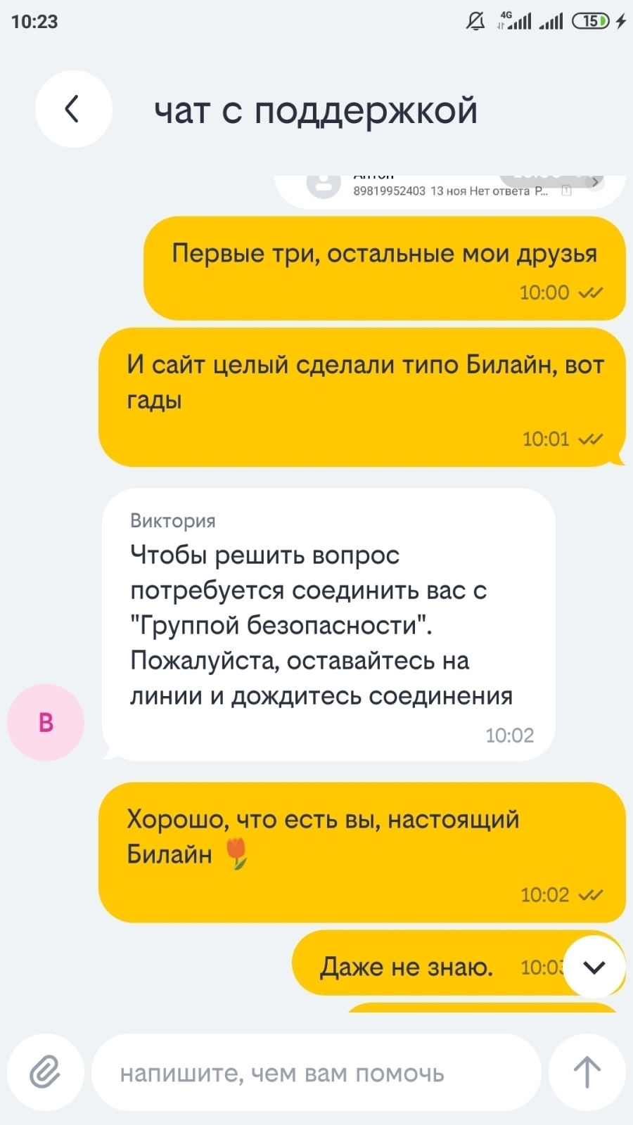 Скриншот автора. Переписка с Билайн