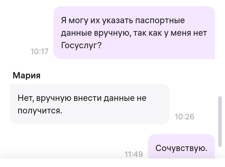 Ну прямо как в Терминаторе думаю, где он говорил, что мне нужна твоя одежда. Ну допустим разово я бы мог предоставить паспортные данные, но предоставлять данные из личного кабинета Госуслуг, то возникает много вопросов. Как они там будут храниться, кто будет иметь к ним доступ и т.д. Тем более у меня нет личного кабинета на Госуслугах. Что я честно сообщил в чате WB.