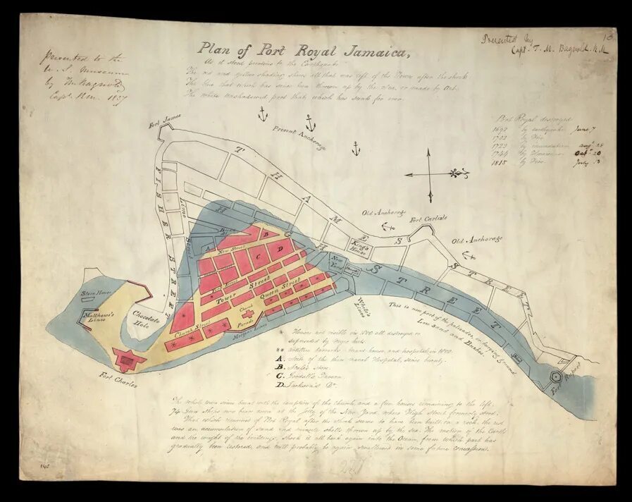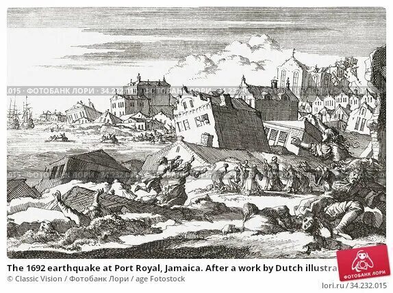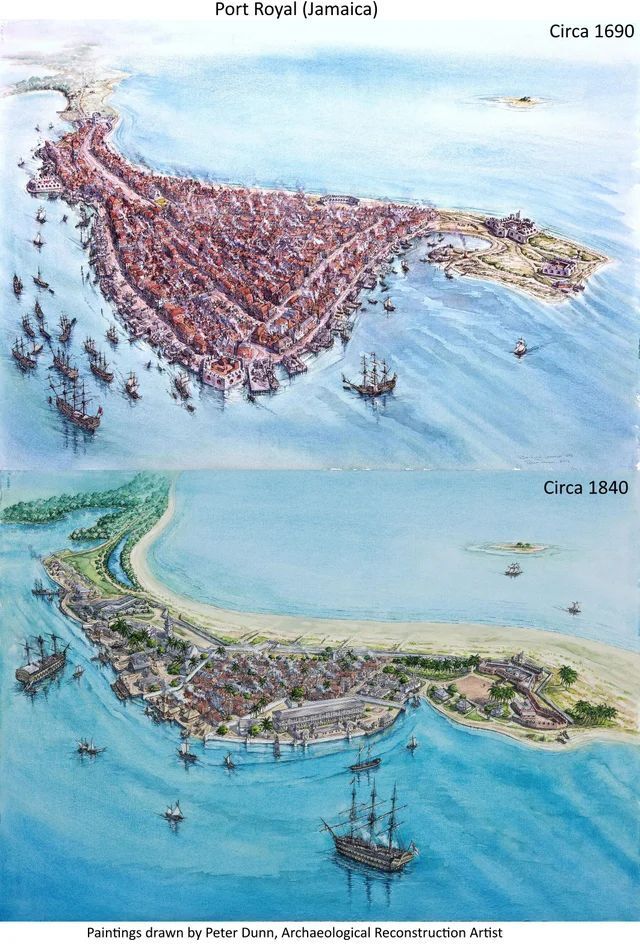 Причём тут бог? Карибы, и точнее самая Ямайка- архипелаг расположены над крошевом из тектонических разломов, их там целая куча. Там сосредоточились стыки различных разломов. В 1692 кажется, произошло мощное землетрясение. Часть полуострова Порт-Роял захлестнуло цунами, которое снёсло большую часть деревянных построек, вроде того, что было в Японии когда там плыли целые улицы с домами. Но это была ерунда, из за землетрясения часть одной из тектонических плит сдвинулось на несколько метров, это вызвало оседание дна как раз расположения полуострова. Часть полуострова начало погружаться в море. Это был не мгновенный процесс, но много народа стало оттуда переселятся, место потеряло былую привлекательность. На старинных картах видно какая часть полуострова ушла под воду. И так Порт-Роял выглядит сейчас.