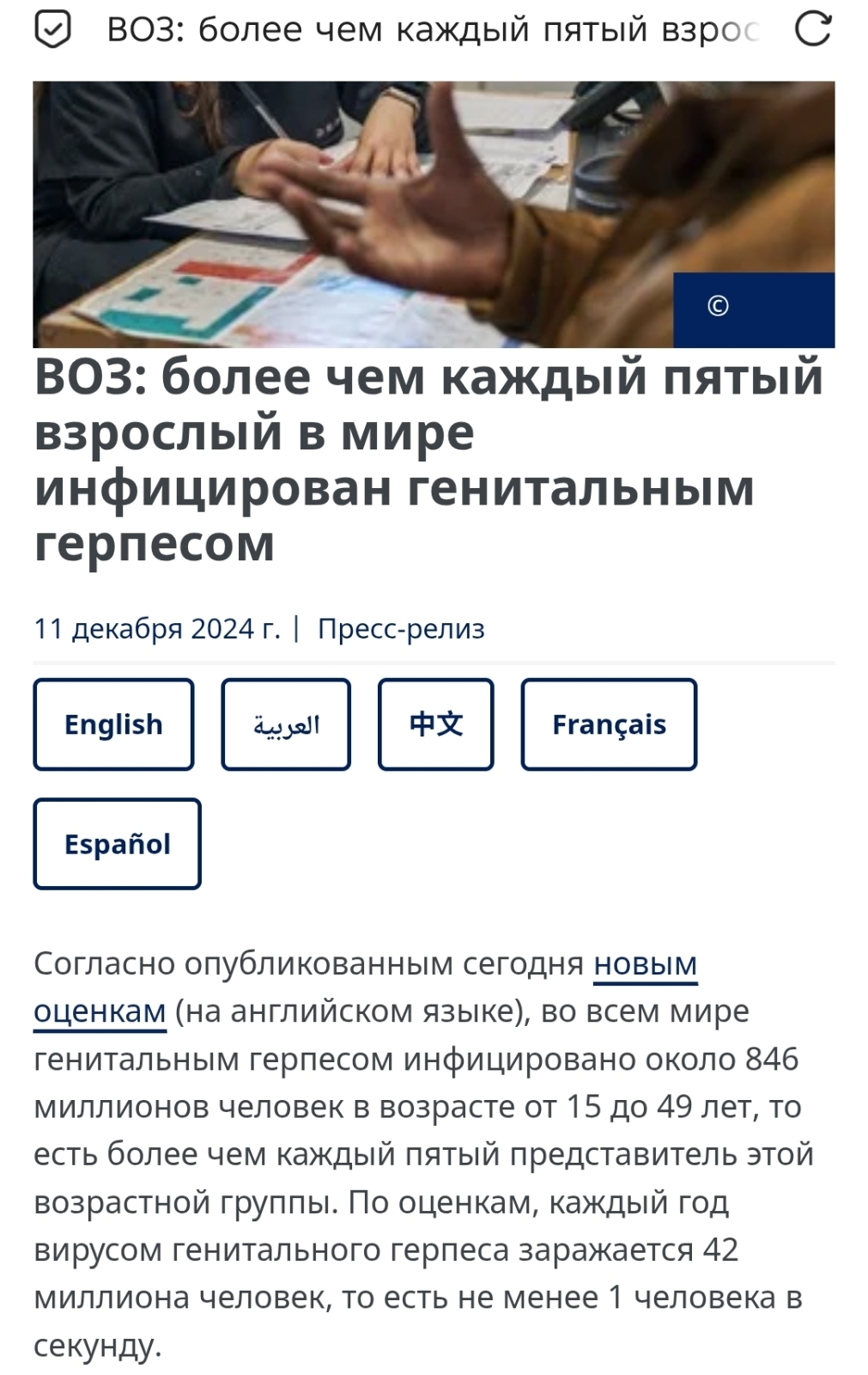 Статистика неутешительна. Ежегодно вирусом герпеса заражается 42 млн. человек (https://www.who.int/ru/news/item/11-12-2024-over-1-in-5-adults-worldwide-has-a-genital-herpes-infection-who). См. скриншот.