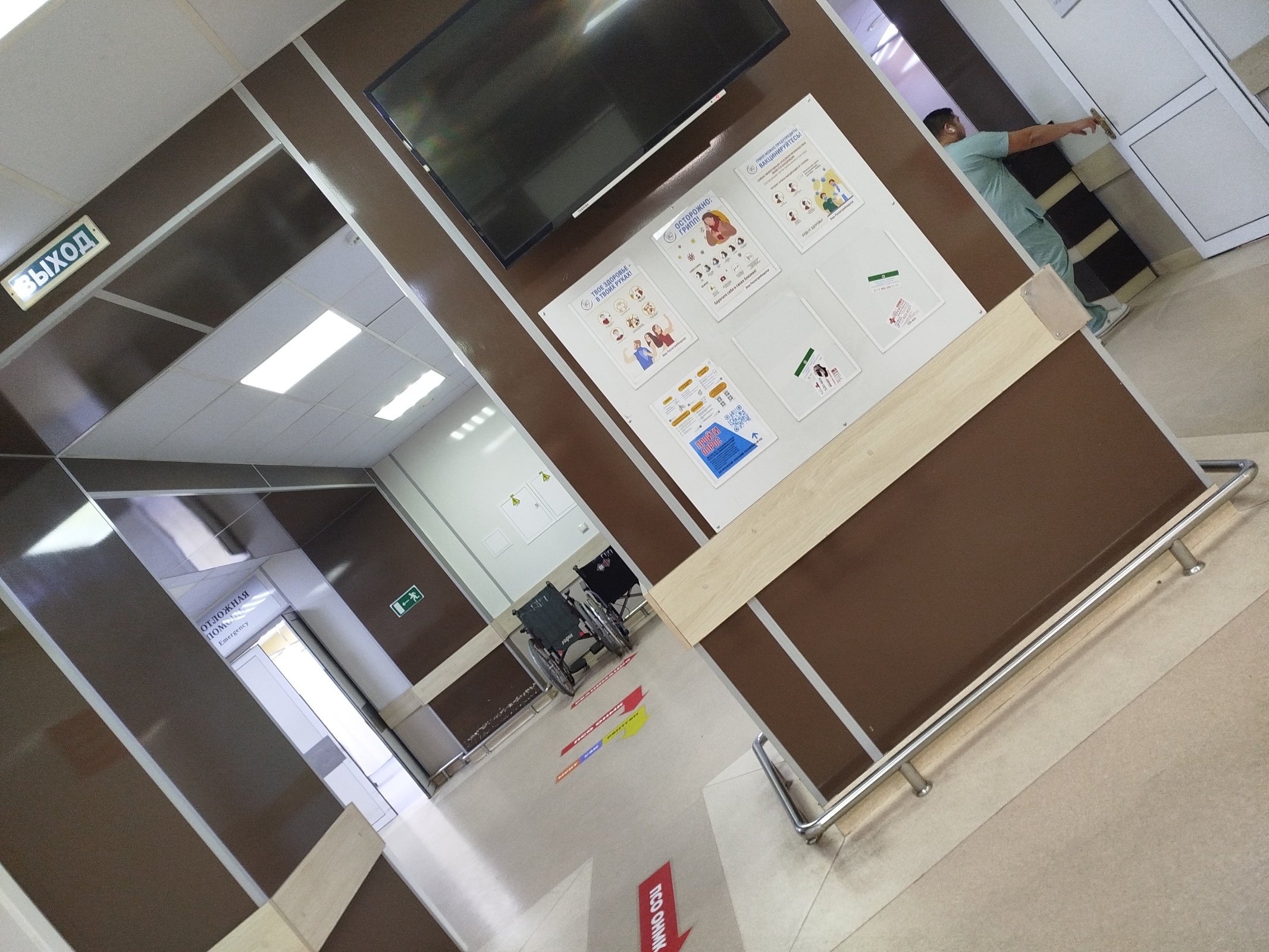 Рядом сидела бабушка и ждала супруга, который был напротив на перевязке. Там же куча кабинетов с разным оборудованием. ЭКГ, облучение, перевязочная и что душе угодно.