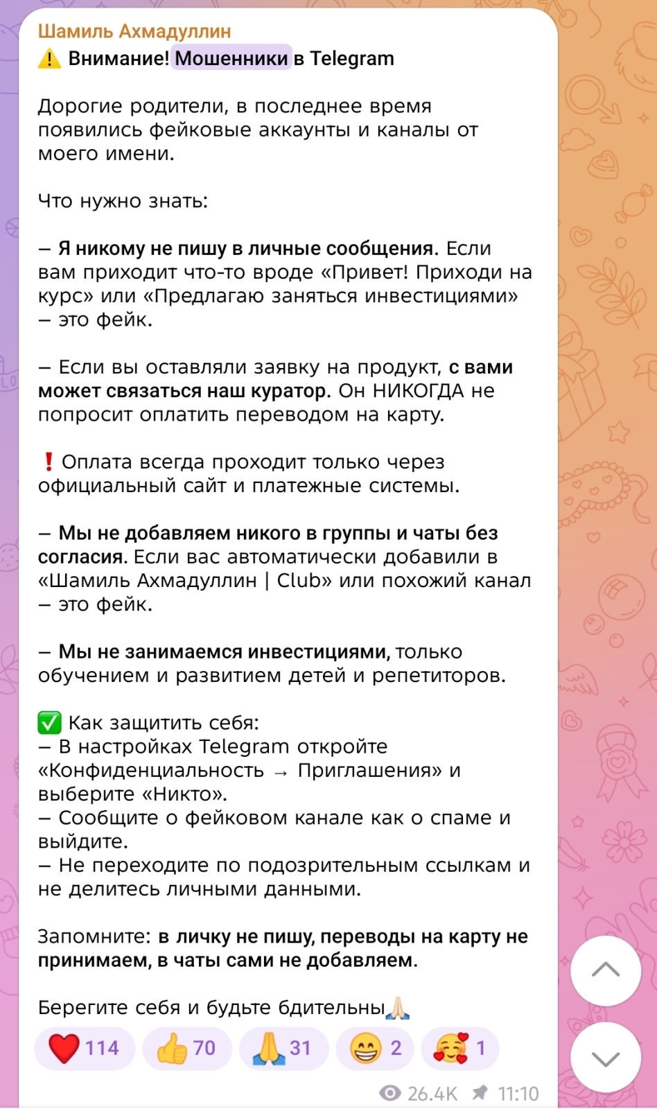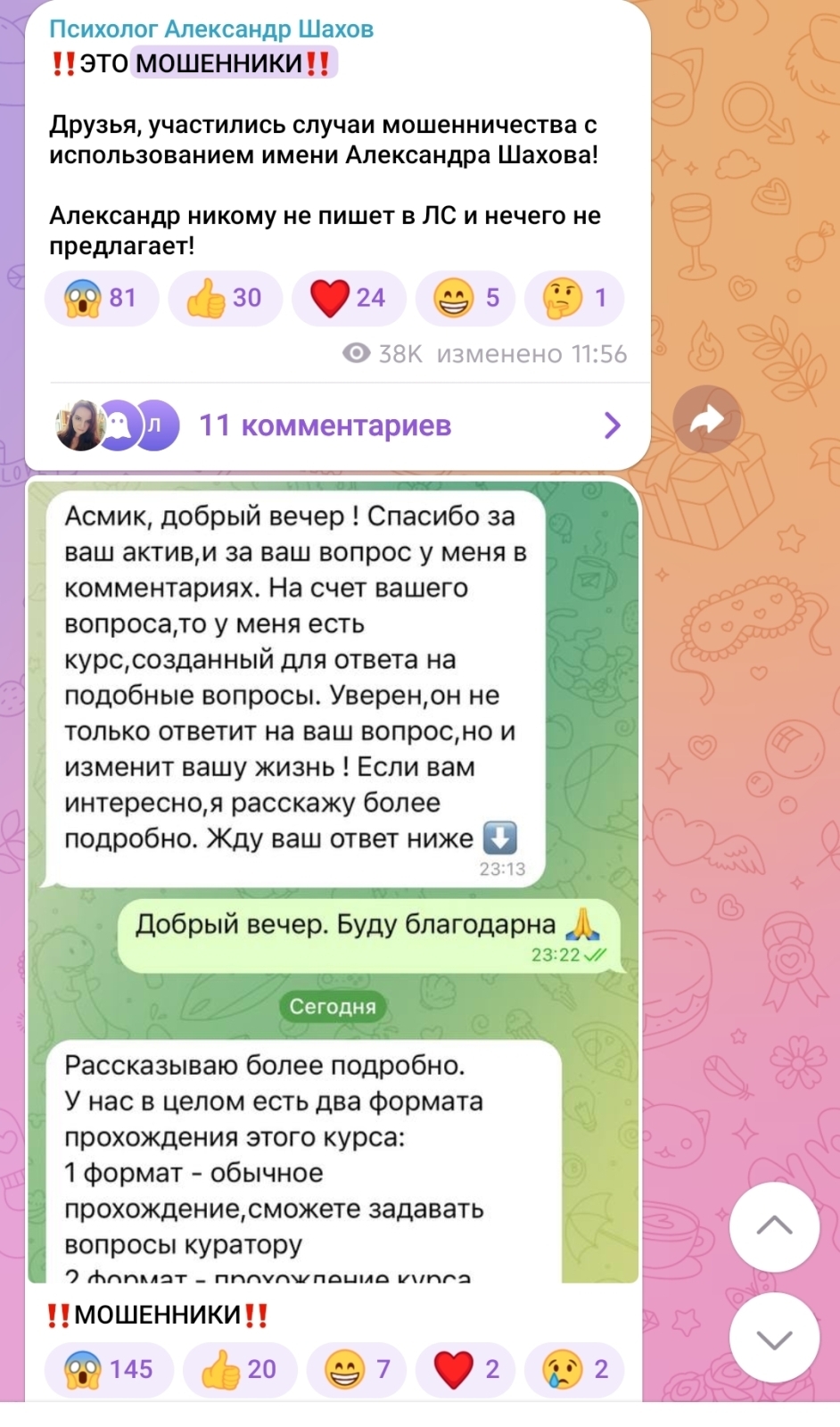 Это говорит нам о том, что важно перепроверять информацию, пришедшую в смс, у официальных представителей. Например, я подписана на психолога, директора университета А.Шахова, от имени которого также делают рассылки. Но, официально от команды А.Шахова приходит информация через официальный бот или эмайл, за какой-либо ресурс тебе выставляют официальные счета, и они никогда не приходят в личные сообщения.