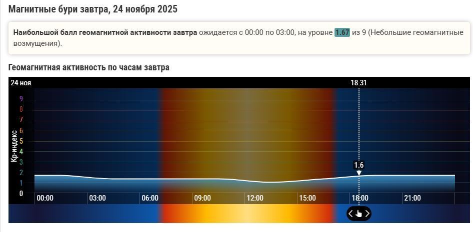 Начало рабочей недели обещает быть тихим, однако ближе к концу первой половины недели магнитная активность постепенно повысится. Рассмотрим подробнее ситуацию с магнитными бурями на 24 ноября 2025 года.