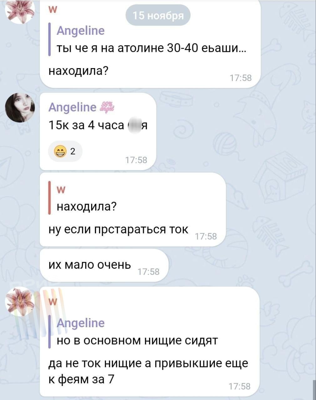 Судя по переписке за встречу работницы секс индустрии брали 20 000 рублей, сейчас уже готовы скинуть 5 000 и работать не покладая ...... за 15 000 рублей.