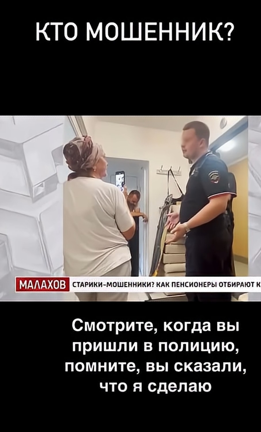 Вот, например, история взята из передачи «Малахов». Женщина, 71 год, продала жильё за 17 миллионов. Потом пришла в банк и запросила выдать эти деньги. Банк сообщил в полицию и риэлтору. Женщину с деньгами доставили в участок, где проводили беседу. А потом она вышла, отдала кому-то деньги и подала в суд. Покупатель, который копил 40 лет остался с носом.