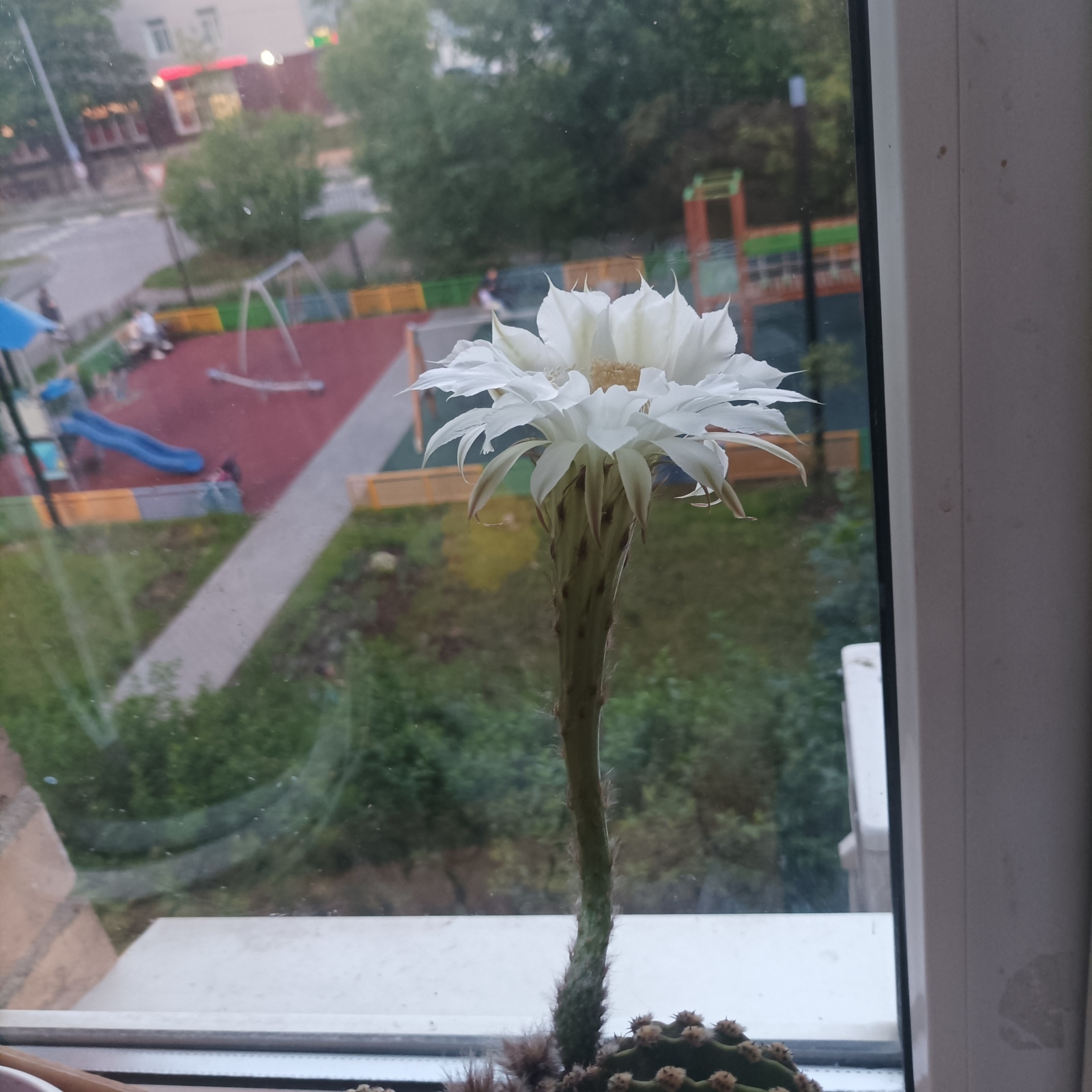 Эхинопсис , у меня 20 лет жил, но не цвел, вдруг зацвел- третий белый цветок на видео- "мой", это был приятный шок- огромный красавец... Цветёт несколько часов, меньше суток... Ещё много раз радовал, потом опять непонятно почему перестал цвести.