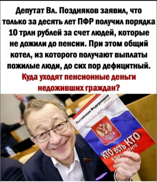 Таким образом можно сделать вывод, что государство призывает копить деньги на безбедную старость, можно сказать, тем самым снимая ответственность с себя, в духе памятного высказывания «государство никому ничего не должно». Но это про тех, кто сегодня находится уже на пенсии. И не может от нее откладывать на «черный день». Судя по всему, оно должно только классу, который сегодня правит в России, а все остальные – пусть выживают уж как-нибудь сами.