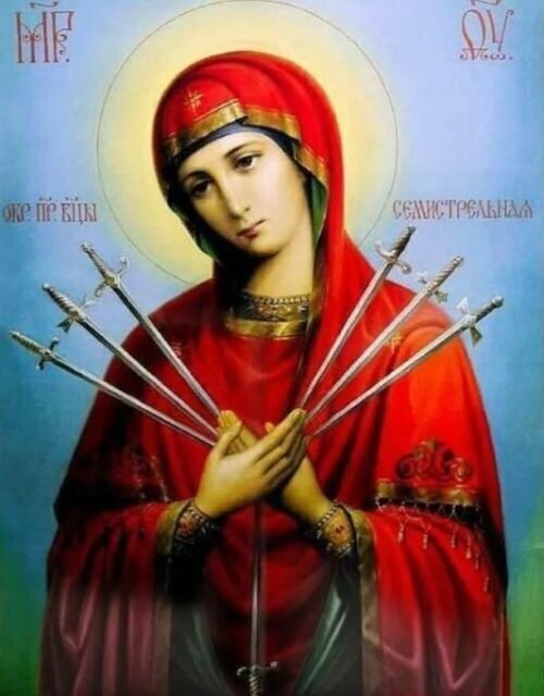 Считается, что эта икона обладает мощнейшей силой. Находясь дома или в любом помещении, она защищает его обитателей от злых и завистливых людей, от порчи и сглаза. Семь мечей, изображённых на иконе символизируют грехи человечества, которые приносят Божией Матери страдания. В доме эту икону помещают напротив входной двери: она должна видеть глаза входящего.