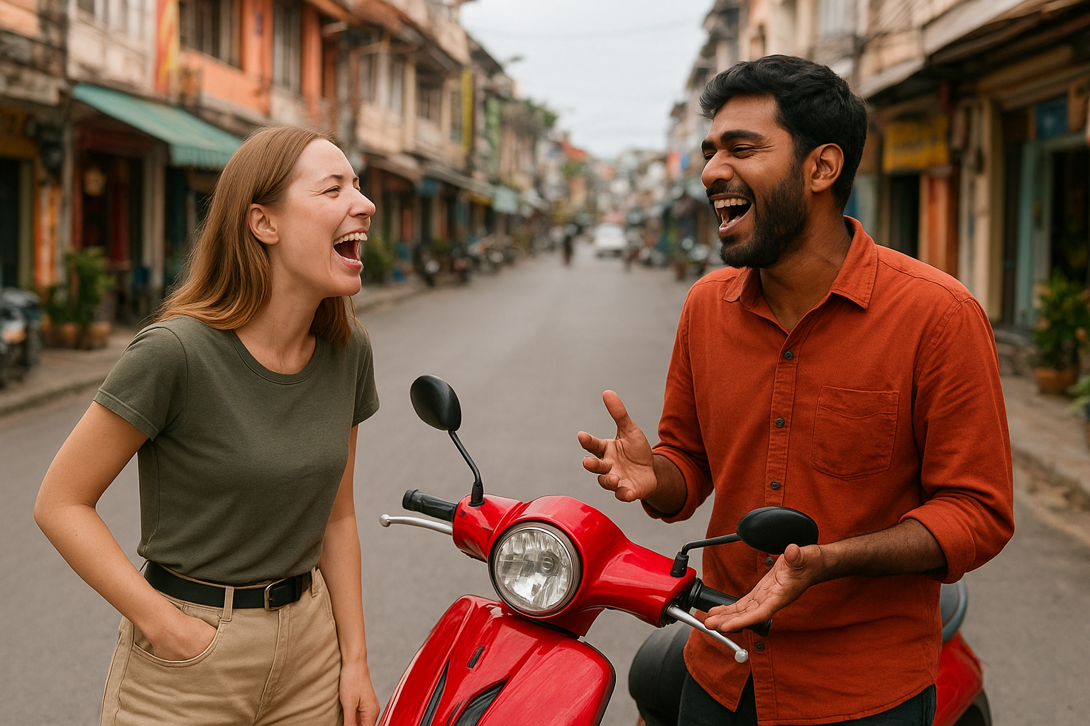 В этот день клиенткой оказалась Оксана из Новосибирска. Взгляд — скальпель, воля — бетон. Характер, отлитый в сибирских морозах Осматривая ряд розовых и зелёных мопедов, она попыталась вести переговоры на ломаном английском: