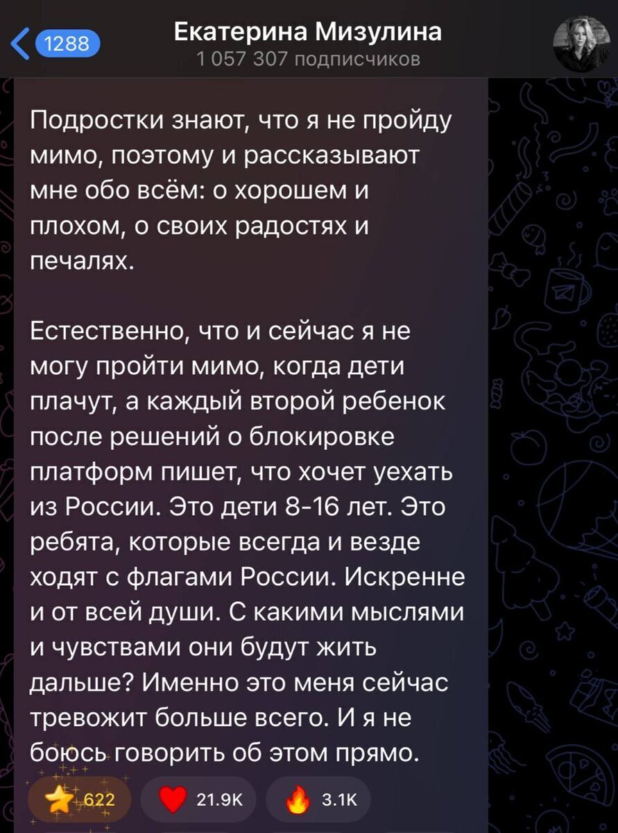 Кстати, зампред Госдумы Владислав Даванков тоже заступился за детей и считает, что блокировка — это перебор.
