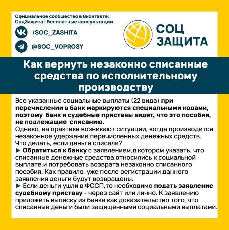 Первое: необходимо подать заявление судебному приставу-исполнителю о возврате списанных средств, приложив доказательства неправомерности взыскания (например, документы, подтверждающие погашение долга ранее, ошибку в расчетах или истечение срока давности или о том, что деньги списаны с детского счета и пр.).