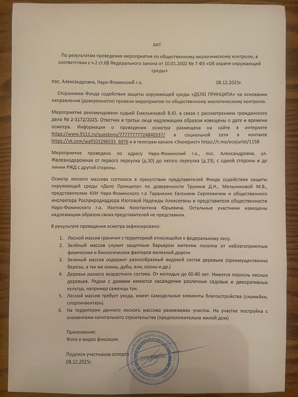 Мы писали здесь о том, что судья в Наро-Фоминском городском суде назначила сторонам совместный осмотр спорного лесного участка. Как обещали публикуем акт осмотра составленного и согласованного сторонами. На участке зафиксирован лес и, по нашему мнению, незаконная постройка. Судебное заседание по этому делу состоится уже завтра 11 декабря 2025 года в 14 часов в Наро-Фоминском городском суде. Судья Емельянова В.Ю. гражданское дело № 2-3172/2025. Ждем всех желающих.