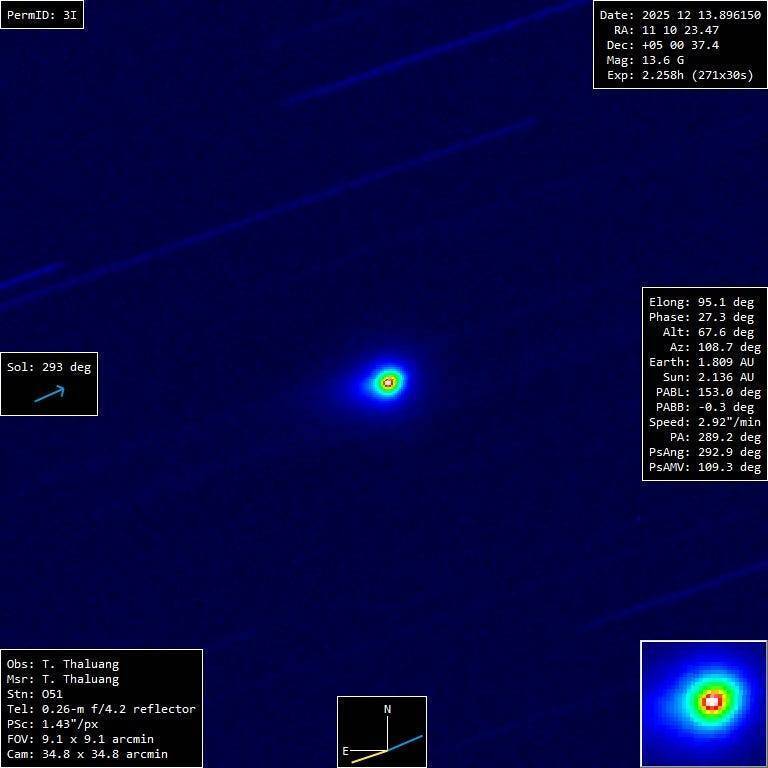 На самом последнем снимке, полученном 13 декабря, астрономом Тирасаком Талуангом с 0, 26-метрового телескопа в Районге, Таиланд, показана карта яркости с заметным антихвостом, направленным прямо на Солнце.