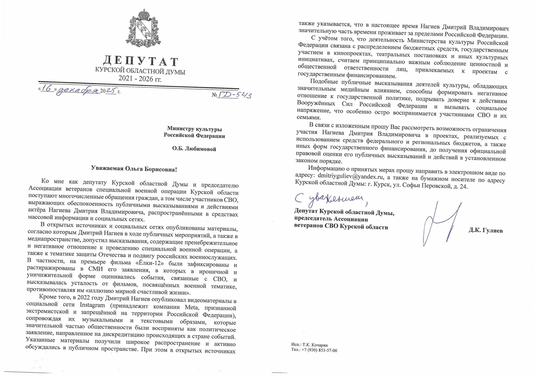 Депутат Курской областной думы Дмитрий Гулиев возмутился таким ответом артиста и тем, с какой ухмылкой он это произёс. Гулиев рассказал и о том, что к нему поступают многочисленные обращения возмущённых граждан Курской области. Поэтому депутат отправил запросы в Минюст с просьбой признать этого «уставшего деятеля» иноагентом и в Минкульт, чтобы этого актёра больше не допускали к съёмкам в фильмах с государственным финансированием.