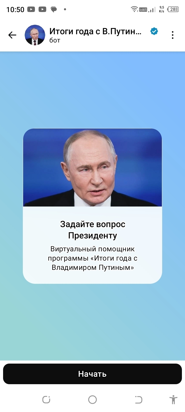 Выбираем чат-бот "итоги года с Владимиром Путиным" и входим на страничку. Запускаем чат-бот нажимая кнопку "начать". Теперь вам необходимо ввести свои данные для регистрации.