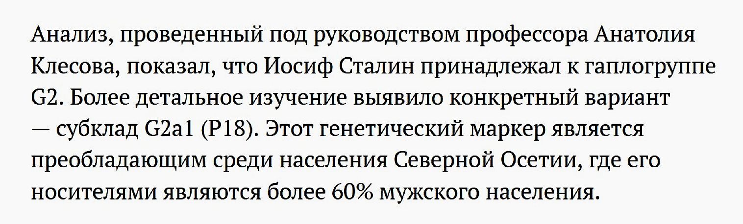 Не смотря на то, что такая гаплогруппа встречается и у других кавказских народов, таких как абхазы, адыгеи и кабардинцы, учёные пришли к выводу, что прямая мужская линия происхождения Сталина является осетинской, а не грузинской.