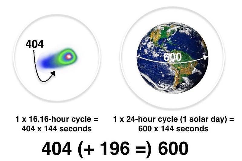 Наши 24 часа содержат ровно 600 единиц по 144 секунды. Таким образом, комета и Земля, кажется, «танцуют» в математическом соотношении 404:600.