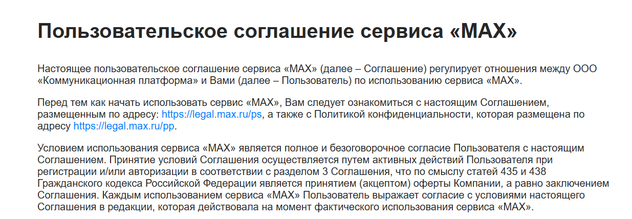 Непонятно также, почему мессенджер МАХ позиционируют как государственный, если в Пользовательском соглашении сервиса указано следующее: