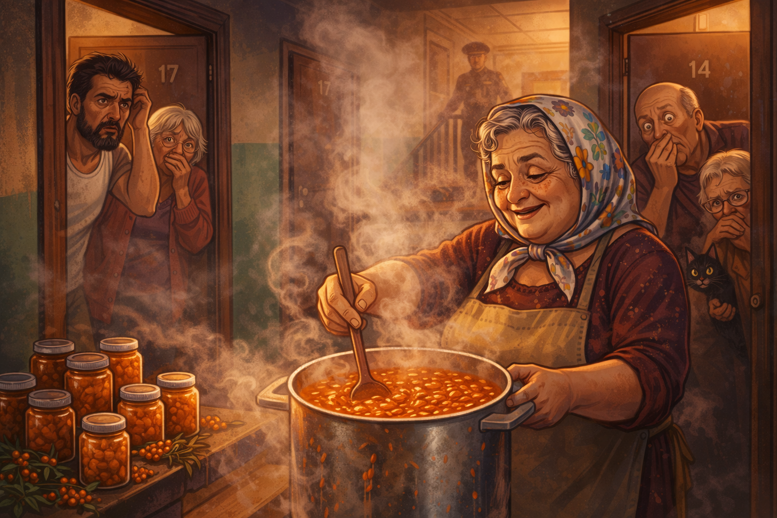 Участковый, постучав в её дверь, застал картину апокалипсиса: кухня в лёгком пару, а в центре, словно волшебница у котла, стояла баба Глаша, помешивая в кастрюле оранжевую, бурлящую лаву.