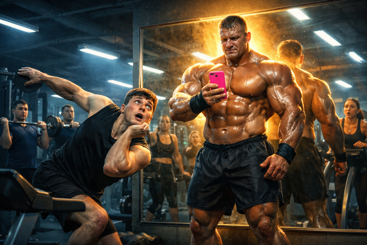 Ты знаешь, как бывает, когда заходишь в качалку? Тишину взрывает только лязг блинов да тяжёлые вздохи. Место, где статуи из мышц разговаривают со своим отражением. И вот в одном таком храме силы, среди обычного вечера, случилась история...