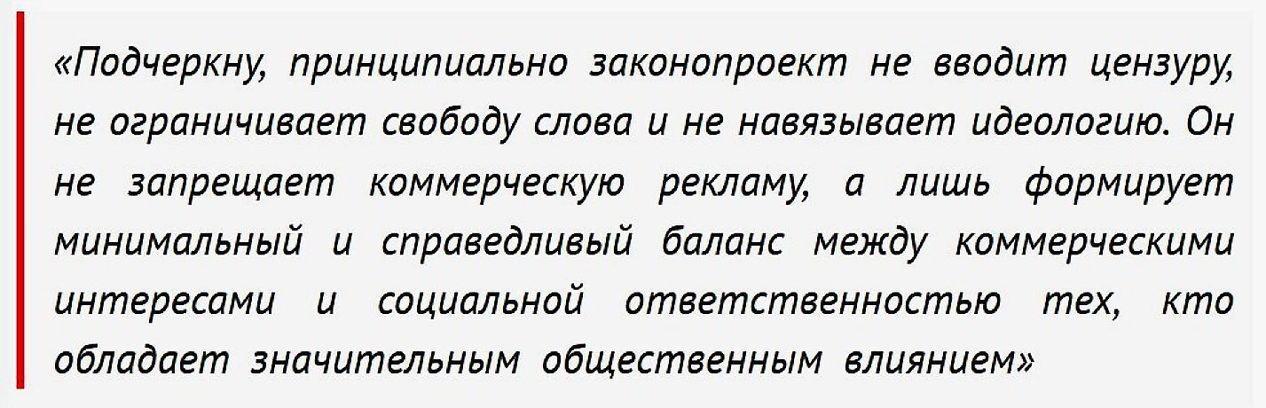 Сенатор озвучил совсем не страшную бесплатную и обязательную цифру в 0,5% от общей массы коммерческой рекламы и подчеркнул, что блогеры смогут самостоятельно выбирать её тематику из семейных ценностей, патриотизма, кибербезопасности и других социально значимых проблем.