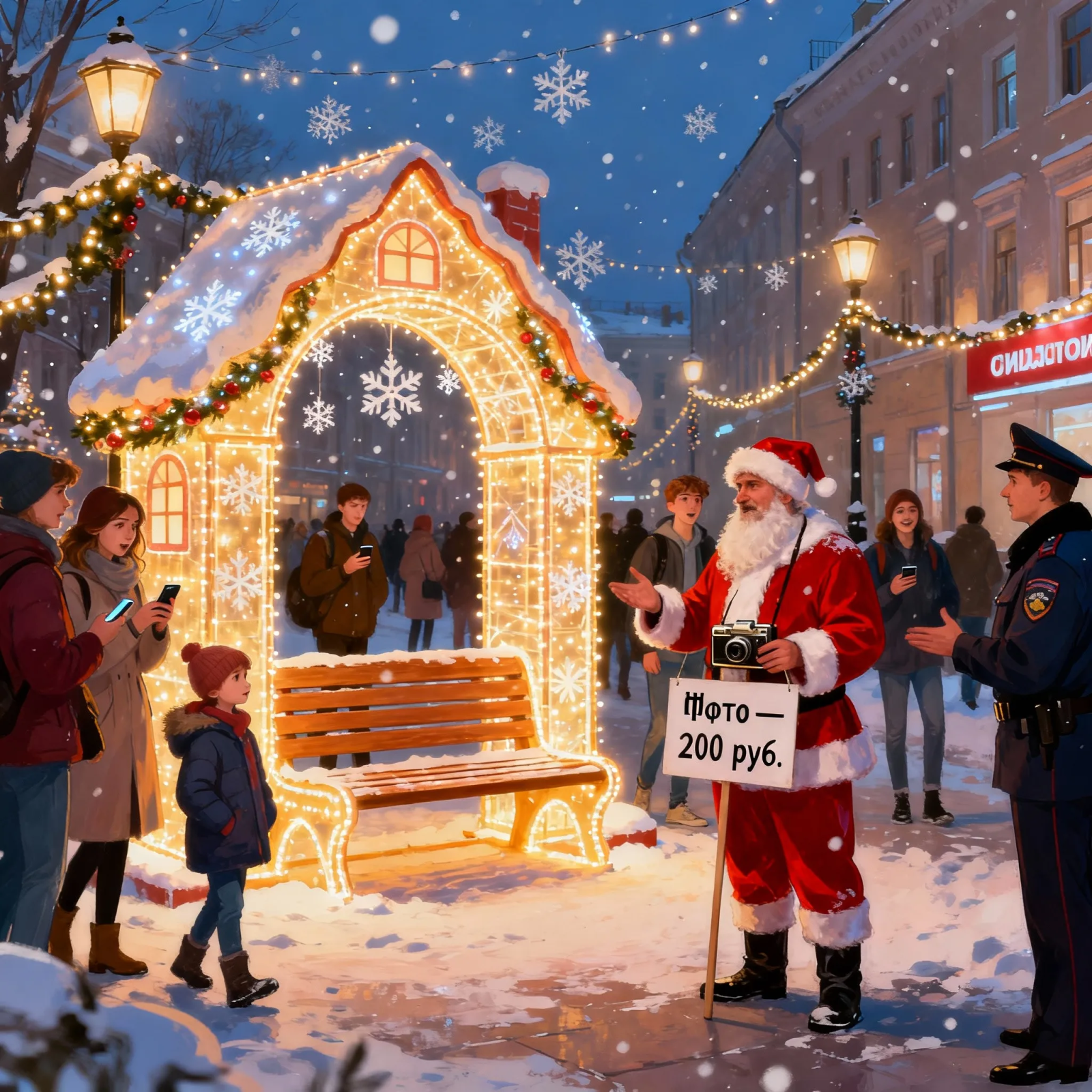 в одном из центральных скверов Анапы произошёл необычный инцидент: полицейские задержали мужчину в костюме Деда Мороза. Он занял праздничную инсталляцию с рисунками и санями, привлекая внимание прохожих и туристов.
