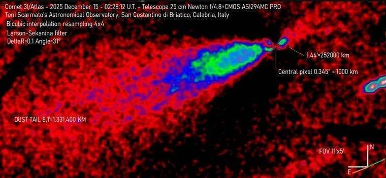 В отличие от комет, которые мы обычно наблюдаем в нашей Солнечной системе и чья яркость обусловлена ​​очень мелкой пылью, комета 3I/ATLAS имеет струю частиц, простирающуюся на 400 000 километров в сторону Солнца.