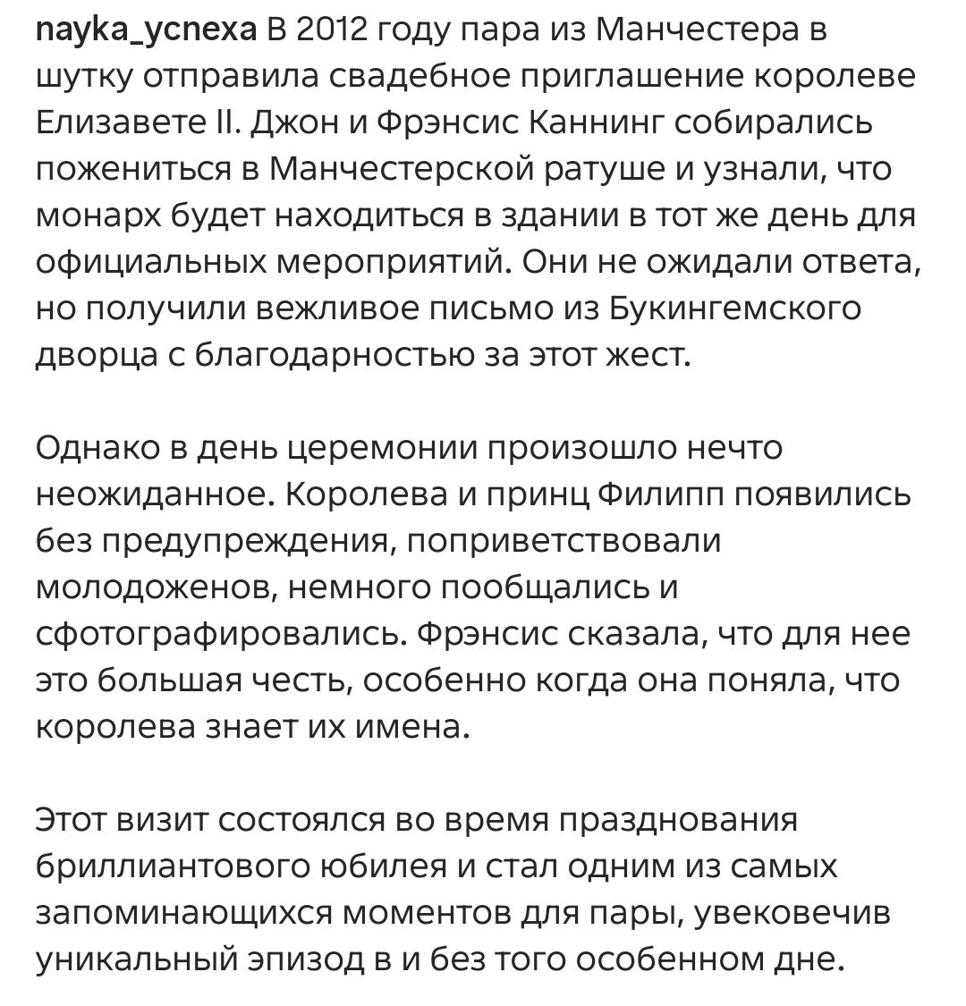 Да. Я любила королеву. Однажды, она гуляла со своим секретарем и встретила американцев. Они стали расспрашивать старую даму, видела ли она королеву хоть раз? И Елизавета сказала, нет, она сама не встречала королеву, а вот ее спутник встречал. Секретарь чуть не рухнул прямо с поле. Но янки...Они стали немедленно фотографироваться с ним. ОН ВИДЕЛ КОРОЛЕВУ. Чувство юмора было очень высоким у нее