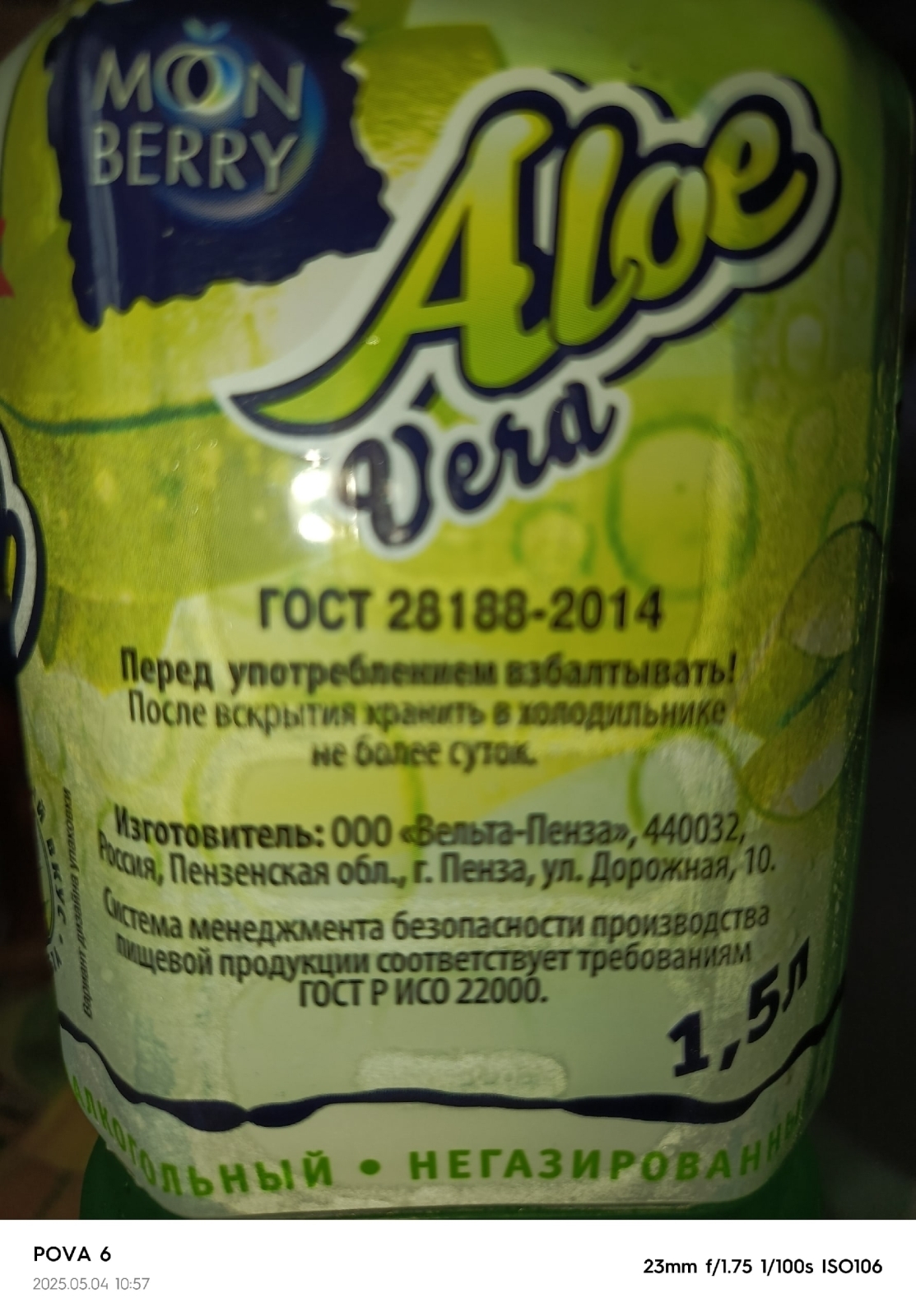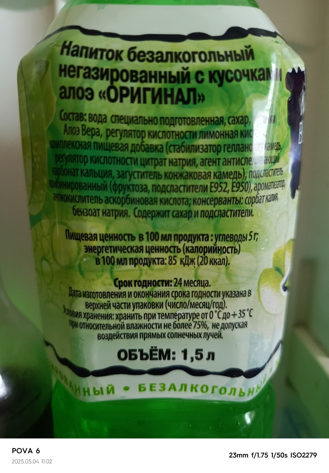 Мне нравится этот напиток, и я часто его покупаю. Он негазированный, утоляет жажду, практически несладкий на вкус. В напитке есть кусочки, это кусочки АлоэВера.