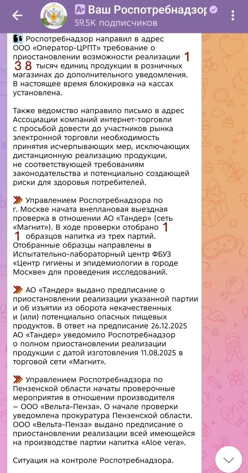 На днях новостной портал Пензаинформ опубликовал новость https://m.penzainform.ru/news/incidents/2025/12/27/napitok_penzenskogo_proizvoditelya_proveryayut_na_nalichie_atcetona.html что напиток АлоэВера с запахом ацетона обнаружили в магазине «Магнит» в Новой Москве. После выпитого напитка пострадал ребенок. Он выпил напиток и получил ожог гортани.