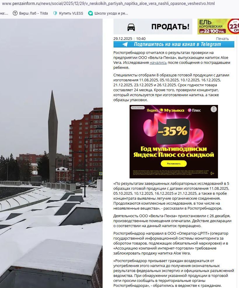 На днях новостной портал Пензаинформ опубликовал новость https://m.penzainform.ru/news/incidents/2025/12/27/napitok_penzenskogo_proizvoditelya_proveryayut_na_nalichie_atcetona.html что напиток АлоэВера с запахом ацетона обнаружили в магазине «Магнит» в Новой Москве. После выпитого напитка пострадал ребенок. Он выпил напиток и получил ожог гортани.