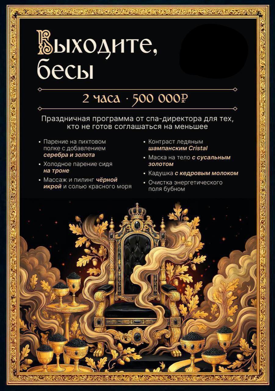 Московские бани, кажется, совсем обезумели! За полмиллиона рублей предлагают "изгнание бесов" с пилингом черной икрой и парением золотом – ну, чтобы уж точно никакая нечисть не устояла.