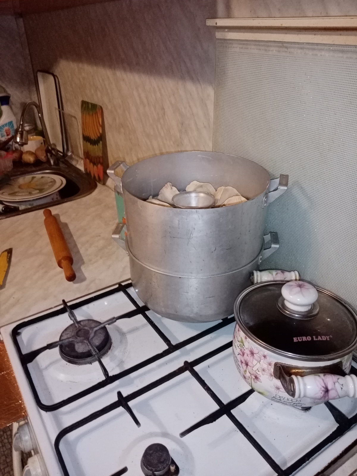 Дома меня ждали три большие "Додо-пиццы", как мне сказали мои мужчины. Но меня это как-то не привлекало. Я смолчала, конечно! Не хотела расстраивать своих любимых мужчин. А дома на кухне замесила тесто на манты, подготовила фарш с луком и специями. В фарш еще дополнительно добавляю молоко для сочности. И через 25 минут налепленные манты уже стояли на огне в полной мантоварке.