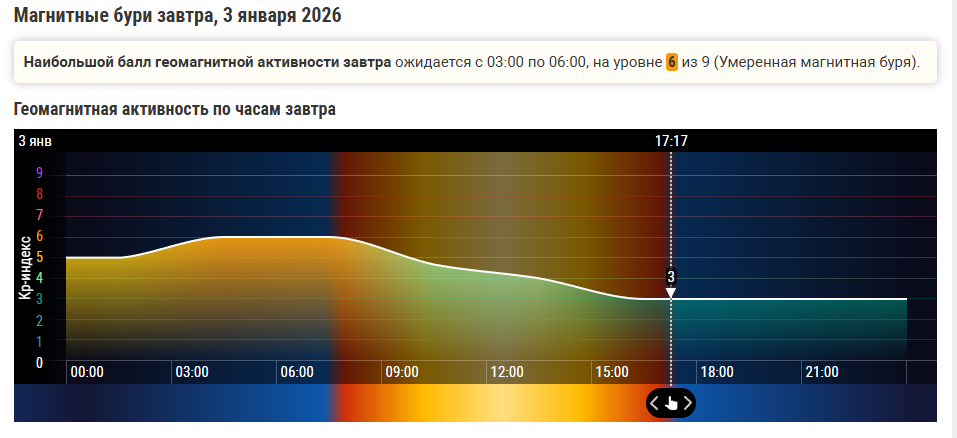 Однако расслабляться рано, ведь 3 января принесет новую волну возмущений. Уже с самого утра ожидается магнитная буря средней силы, которая к полудню наберет обороты и станет более мощной и продолжительной. Этот день станет настоящим испытанием для чувствительных к геомагнитным колебаниям, поэтому стоит позаботиться о себе заранее. К вечеру 3 января буря начнет утихать, но влияние ее в течение дня будет ощутимым.