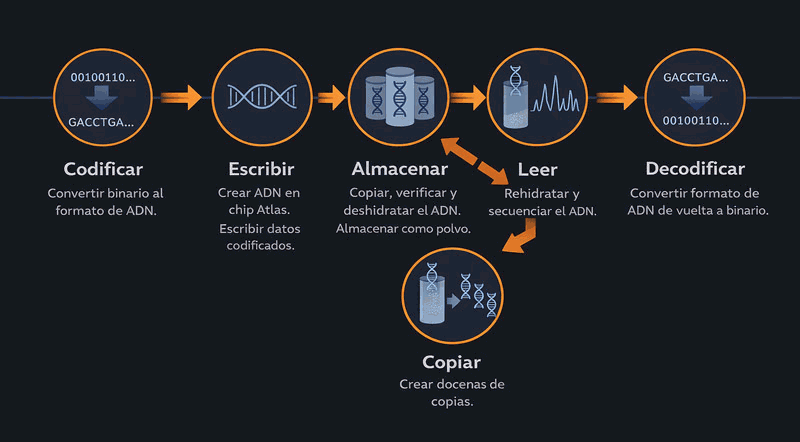 Процесс Atlas включает в себя сопоставление двоичного кода с этими основаниями; например, присвоение «00» букве A или «11» букве T. После установления последовательности ДНК искусственно синтезируется, обезвоживается и хранится в виде порошка внутри стальных капсул размером всего 1,8 сантиметра.
