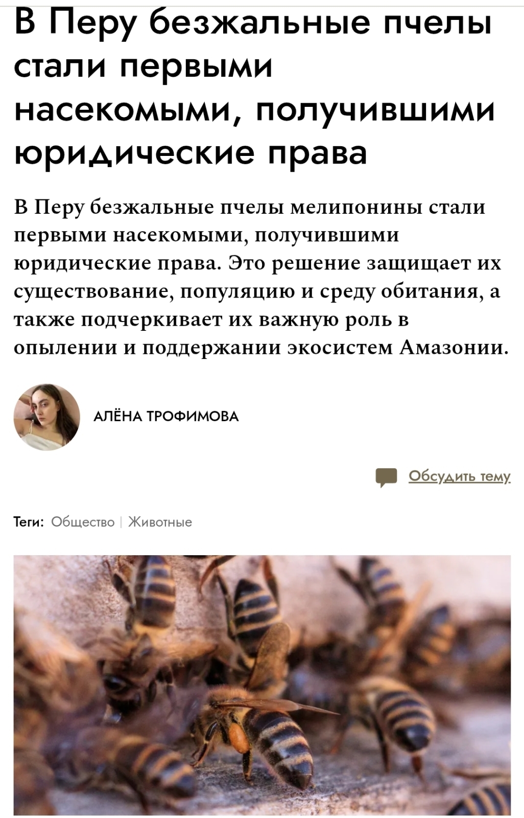 Выпуск журнала https://www.novochag.ru/stars/news/v-peru-bezjalnye-pchely-stali-pervymi-nasekomymi-poluchivshimi-yuridicheskie-prava/ на одной из своих страниц, посвящённых миру животных, рассказывает о безжальных пчёлах (прочитала сначала безжалостных).