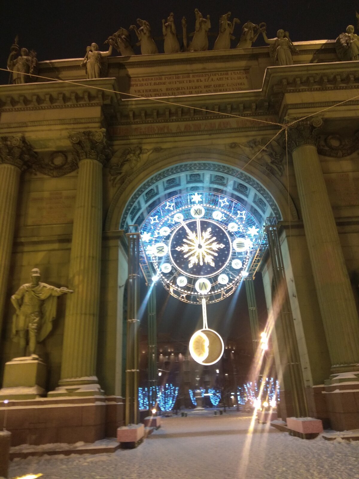 Я иду и думаю, что Петербург в Новый год становится особенно откровенным. Здесь прошлое и современность держатся за руки, а часы между воротами напоминают, что время — это ещё один повод улыбнуться. И если хочешь увидеть город по‐настоящему празднично, просто идёшь к этим гигантским часам, где свет и история встречаются под боем курантов.